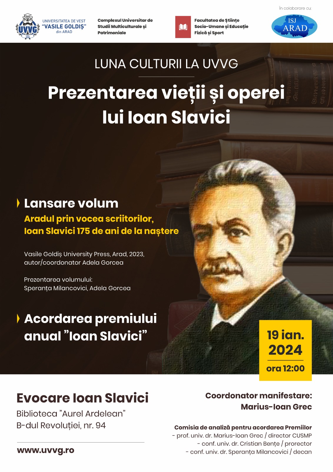 În ziua de 19 ianuarie 2024, de la ora 14:00, la Biblioteca „Aurel Ardelean”, B-dul Revoluției, nr. 94, va avea loc evenimentul „Prezentarea vieții și operei lui Ioan Slavici”, un prilej minunat de a explora și sărbători contribuția lui Ioan Slavici la patrimoniul cultural românesc.
